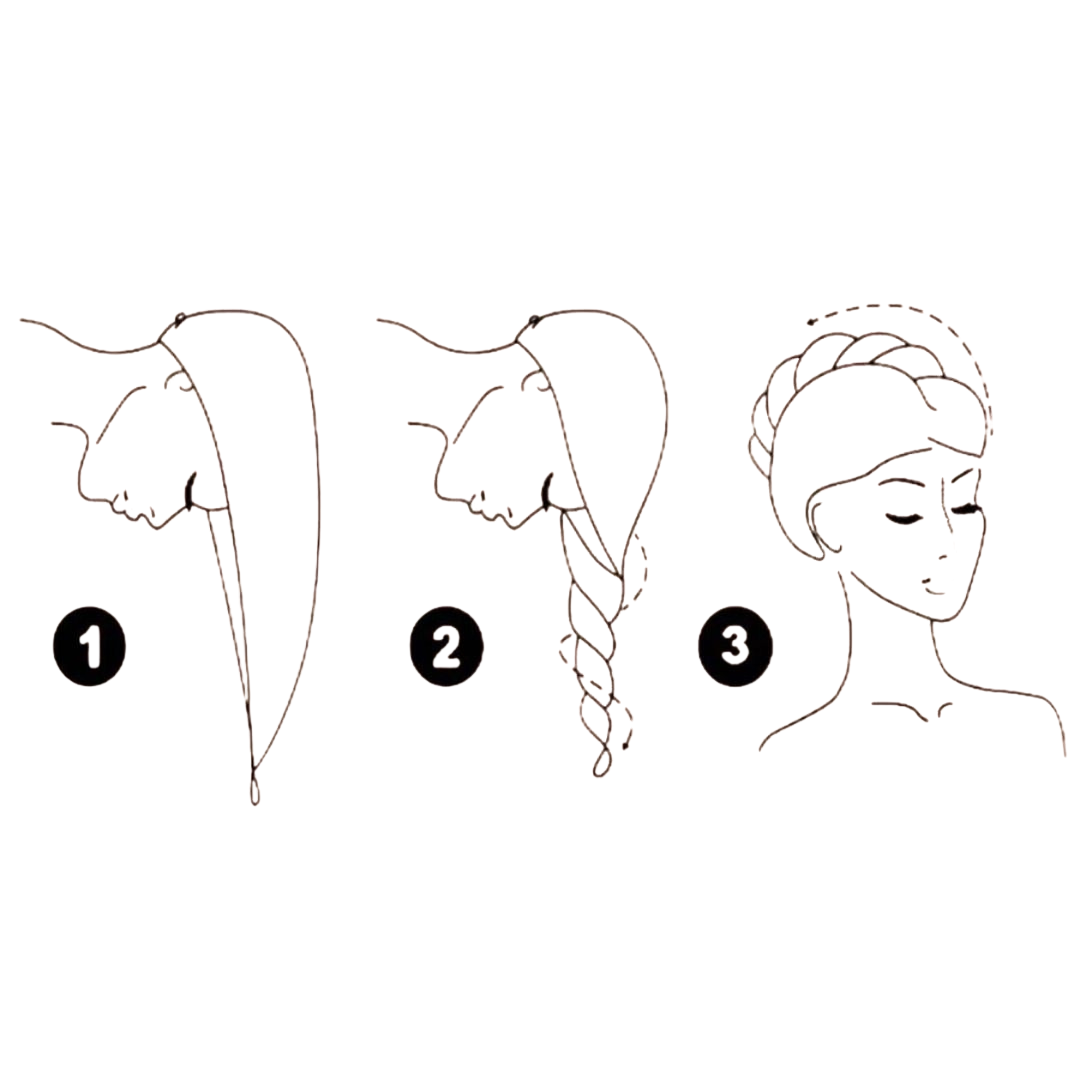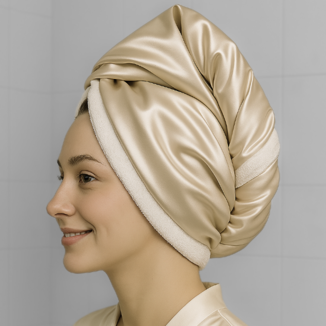 1. Po umyciu włosów przechyl głowę w dół i załóż turban jedwabną stroną do środka tak, aby guzik znajdował się na karku.