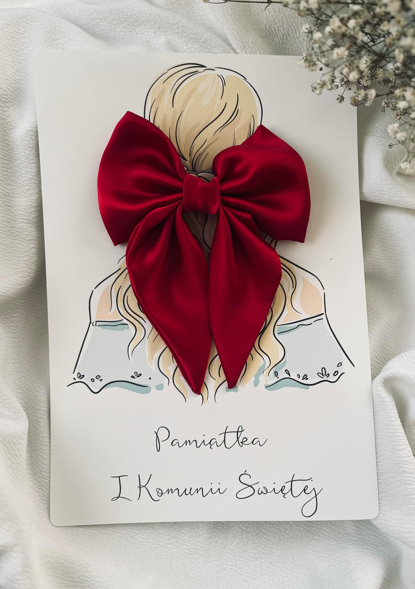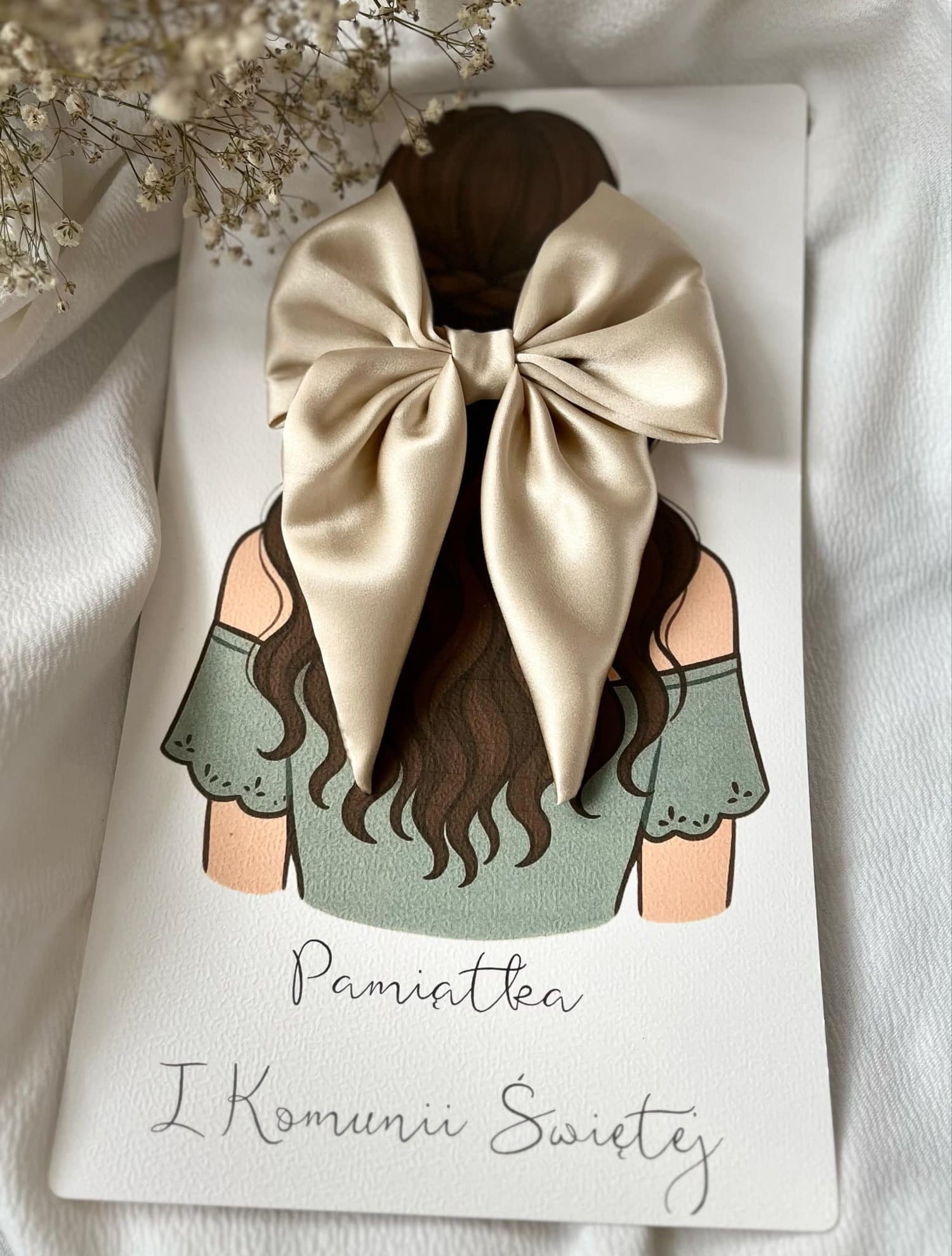 Na froncie znajduje się ilustracja dziewczynki z długimi włosami, do których przypięta została prawdziwa jedwabna kokarda – na eleganckiej spince, którą można później wykorzystać jako stylowy dodatek do fryzury.